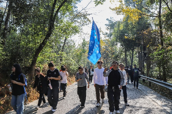宣讲结束后,登山活动正式启动。同学们从云麓山庄出发,沿着“中南小团子 微信小程序规划的安全路线,途经半山腰小亭子、长沙会战碑等打卡点,最终抵达岳麓山电视塔。各打卡点设置了特色打卡姿势,从“攀登起步”的握拳高举,到“步步登高”的阶梯式站位,再到终点“胜利”手势的集体呐喊,每一个环节都凝聚着团队协作的力量。
