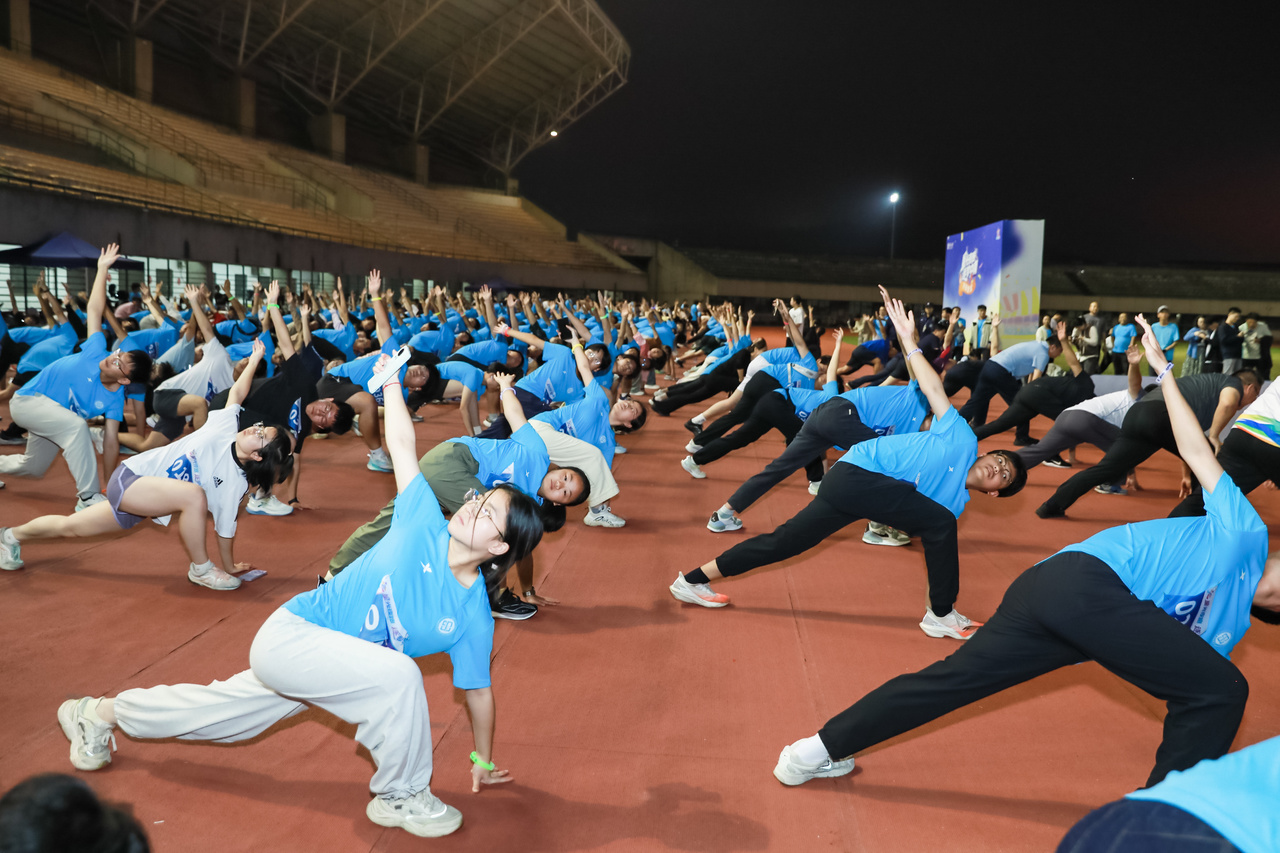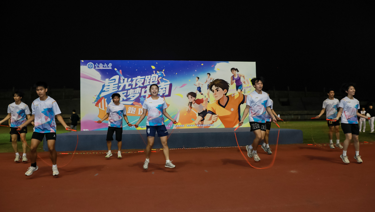 师生们在专业人员带领下舒展身体、活络筋骨。随着开跑口令的响亮发出,鲜红的活动旗帜在夜色中率先扬起,师生们紧随其后,脚步声与音乐律动共振,呼吸声与夜风细雨相融,大家热情奔跑、你追我赶、互相鼓劲,荧光手环与沿途灯光交织成校园夜景中的流动星河,营造了浓厚的校园运动氛围,生动展现了中南学子的昂扬风貌。