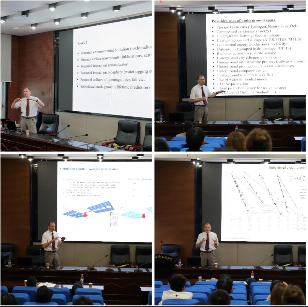 报告会上,Konietzky教授围绕地下空间可持续开发利用,系统介绍了地下空间在能源储存、地热利用、基础设施建设、防灾减灾等方面的应用潜力,深入分析了地层变形、环境影响、长期稳定性等关键技术与安全风险。结合大量研究案例与模拟成果,重点讲解了废弃矿井资源化利用、盐矿长期力学行为、核废料地下处置库热-力-水耦合分析等前沿内容,展示了InSAR监测、3DEC/FLAC3D数值模拟等技术在工程实践中的应用,兼具理论深度与实践价值。